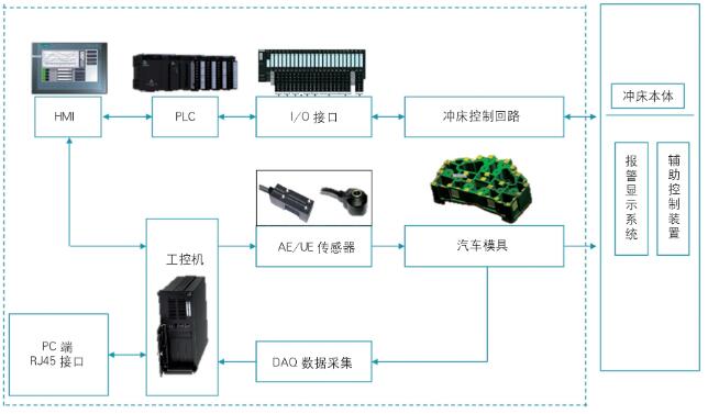 本系统主要由高精度传感器(AE/UE 传感器,测量半径为200 ~300mm)、冲压控制系统、数据采集分析模块、报警显示系统组成,如图1 所示,应用于汽车模具冲孔、修边、整形等生产工序。