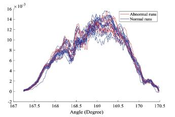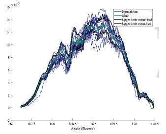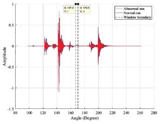 从图4 中观察到冲击部分信号有较多的“毛刺”,即高频成分。为了更好地显示结果,我们将采集到的曲线根据角度进行筛选,同时对过滤后的信号进行去高频处理。得到加窗处理后曲线,其中红色曲线为检测异常曲线,蓝色曲线为正常曲线,如图5、图6 所示;根据多次测试,建立标准曲线包络图。