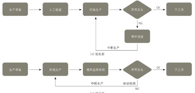 模具作为汽车冲压车间的重要组成部分,具有开发周期长、调试难度大、价格高等特点。在生产过程中,异物导致零件及模具压坏的问题多次发生,造成零件面品不良率居高不下。然而,汽车模具预防保全工作主要停留在人工检查、记录,无法及时发现模具品质等相关问题,存在一定的数据延迟。随着信息化建设的不断加强,越来越多的企业采用信息化手段,将传统的人工纸质粗放式管理转化为数字化精细管理,其中部分小型模具逐步实现在线检测。