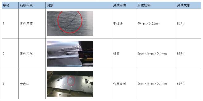 为了检测零件压痕、压伤、毛刺、带起等问题,分别使用毛绒线、纸屑、金属废料等进行测试,均能正常判断异常,整体检测成功率为85%,如表1 所示。