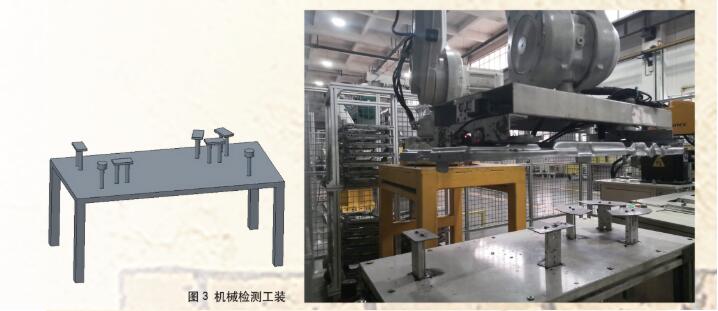 小组经过对零件结构分析及模拟匹配,根据其特点采用机械检测装置(图3),即接触型压力感应装置,对底盘组件各部位进行检测,通过利用压力传感器进行建模设计,模型设计参考底盘组件形状制作仿形工装,在底盘组件每个散件的相应位置增加对应数量的弹簧及压力传感器,可使底盘组件检测完毕后将信号反馈至机器人进行逻辑计算,如存在漏工序异常,机器人将底盘组件剔除,完成底盘组件的检验工作。