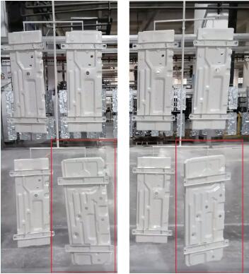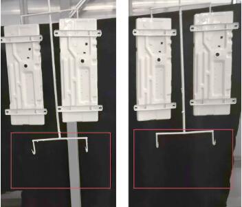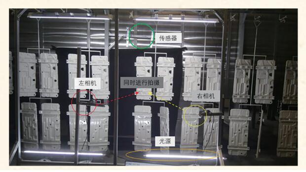 铆接后的底盘组件需进行喷涂加工,喷涂过程中要将零件吊挂在专用挂具上进行清洗。底盘在挂具上吊挂后接触方式为点接触,零件存在180°自由晃动、旋转的情况,喷涂质量不容易控制,必须安排专人在线打点全检,不仅造成人员浪费,还存在严重的缺陷漏检情况。传统的视觉检测因底盘倾斜检测误报、挂具上空挂不报警、不同大小底盘同时吊挂出现误报情况,且喷涂线体在线检测难度较大,使用传统的检测方法不易实现。