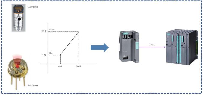 我们所使用的传感器,均为西门子S7-400 控制系统可识别的4 ~20mA 量程的智能硬件,通过ET200S 从站模块,经过PROFIBUS 总线,将采集到的