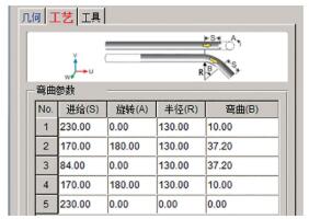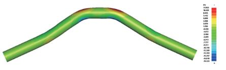 利用有限元分析软件建模,对管坯进行弯曲成形模拟,设置弯管成形参数时,轴线尽量与最终所需零件的轴线相近,确保能顺利放到后序成形模具型腔中,避免啃模现象的出现。图3 所示为弯管成形时设置的参数,图4 所示为弯管工艺分析模型,图5 所示为弯管后的零件减薄云图。