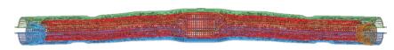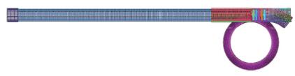 零件的横截面由两端的圆形慢慢过渡为中间的矩形,因为矩形横截面的高度小于圆形毛坯的直径,故需要采用压弯预成形工序,将坯料压扁,同时调整零件的轴线,使零件轴线基本与最终轴线一致。图6 所示为压弯成形工艺分析模型,图7 所示为压弯成形后的零件减薄云图。