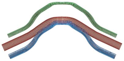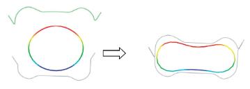 修改型面后,零件最大减薄处在压弯过程中的截面变化如图12 所示,在胀管成形过程中的截面变化如图13 所示。由图12 可以看出压弯成形时,利用刚性模将圆管成形为两长边内凹、两短边外凸的形状。尽量使短边外凸处与模具接触,以减小内高压成形的胀形量。长边内凹深度在保证内压能够胀起的情况下尽量大,以便在内高压胀形时为圆角处充分补料,进而减小圆角处的减薄。