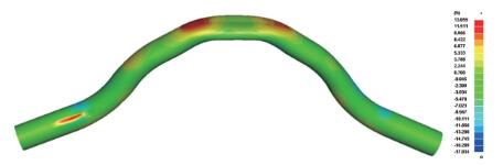 图14 所示为修改压弯模具型面后,零件最终的减薄云图,由图14 可以看出零件的最大减薄率是13.9%,符合技术要求中的减薄率要求,零件表面没有明显的起皱和破裂,此工艺方案可行。