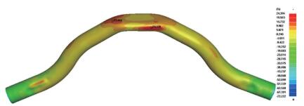 参考模拟成形的参数进行实际零件试制,利用弯管机制作弯管,将弯管后的零件放入型面修改后的压弯凹模中,凹模不动,凸模合模下压,加压300t,保压3s。成形后零件如图15 所示。