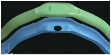 由图10 可以看出胀形后零件的最大减薄率为24.3%,位于矩形截面的圆角处,大于零件技术要求中的减薄率(15%)。截面为圆管的毛坯胀形成为截面为矩形的毛坯时,胀形量最大为8.68%,圆角处最后贴模,因此减薄危险区主要集中在四个圆角及短边处。由于减薄危险区距离管端较远,增加侧推进给量对中间减薄作用并不明显。本文采用修改胀形零件的初始形状(即压弯成形后的零件形状)的方法,提高零件的极限膨胀率,进而成形大周长矩形。在横截面为矩形的压弯模具的凸、凹模上增加两个“凸包”,修改后的压弯模具型面如图11 所示。