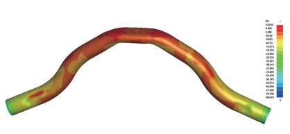 压弯成形完成后,利用内高压胀形工艺成形零件最终形状及尺寸。将零件放入胀形模具中,在无合模力的情况下,凸模下行至完全合模。施加合模力和管内液体压力,两端推头推料,最大合模力1500t,最大液体压力180MPa,最大推料量20mm。图8 所示为管内压力加载曲线,图9 所示为胀形工艺分析模型,图10 所示为胀形后的零件减薄云图。