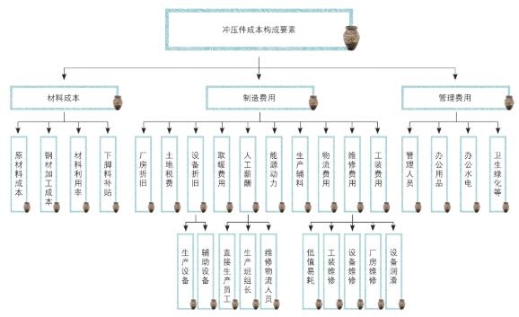 对于自制冲压件完全成本,主要构成要素包括材料成本、制造费用、管理费用等,每部分有众多的相关要素,分解后构成如图1 所示。