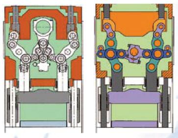 YAMADA DOBBY 不仅仅采用曲柄滑块机构作为工作机构,还采用两种形式的多连杆机构(图5,其中的NXT 型最大公称力为2000kN)。