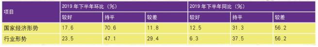 2019 年下半年与2019 年上半年环比情况:国家形势方面70.6%企业选择持平;行业形势方面47.1%企业选择持平,29.4%的选择减少。2019 年下半年与2018 年下半年同比情况:国家形势和行业形势方面都有56.2%企业选择同比减少。说明大部分企业对2019 年下半年的经济形势和行业形势持普遍悲观态度,也反映出国家和行业经济运行困难,企业运营普遍艰难。具体数据见表1。