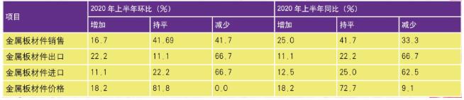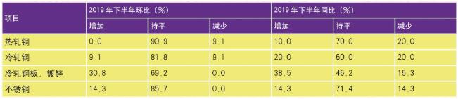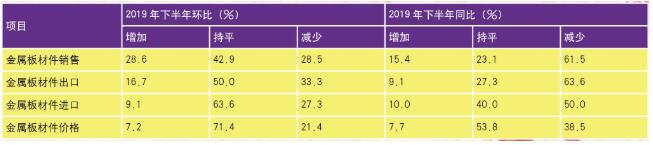 2019 年下半年与2019 年上半年环比情况:销售额方面上半年与下半年基本持平;在板材件的进出口和价格方面,普遍持平或下降。2019 年下半年与2018 年下半年同比,销售额、进出口、产品价格各方面普遍减少或持平。说明2019 年市场环境较差,企业盈利能力降低。具体数据见表2。