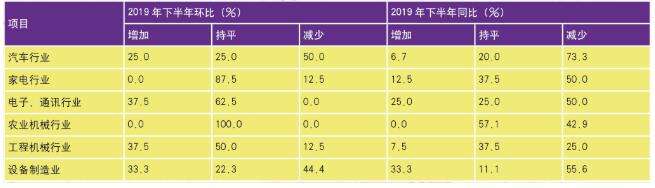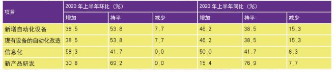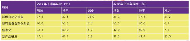 无论2019 年下半年与2019 年上半年环比,还是2019 年下半年与2018 年下半年同比,新增自动化设备和现有自动化设备改造方面选择增加和持平的企业较多;新产品的研发也是选择增加和持平的较多,说明企业尽管经营困难,但在自动化改造升级方面和新产品研发方面的投入并未减少。在降低人工成本、提高效率、提升质量和新产品研发投入等方面持续受到企业的重视。具体数据见表3。