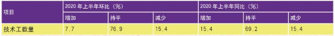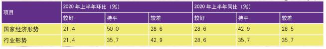 通过调研,2020 年上半年与2019 年下半年环比:国家经济形势方面,50%企业选择持平,28.6%企业选择减少;行业形势方面,42.9%企业认为行业形势环比下降。2020 年上半年与2019 年上半年的同比方面:多数企业选择减少或持平。国家经济下行压力增加叠加新冠肺炎疫情的影响,上半年各行各业都将举步维艰,特别是一季度,有专家认为国家和行业经济形势有望在二季度得到复苏。具体数据见表7。