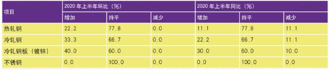 在销售额和进出口方面,无论是同比还是环比,专家对2020 年上半年的预测大都是减少或持平;而在价格方面则普遍认为持平或增加。从这组数据分析看,除了产品价格预期保持平稳,专家们对行业的销售额、进出口普遍持悲观态度。这与整个国家和行业经济形势的判断是一致的。特别是进出口方面,受国际复杂多变的经济形势和疫情影响,进出口将受到较大影响。具体数据见表8。