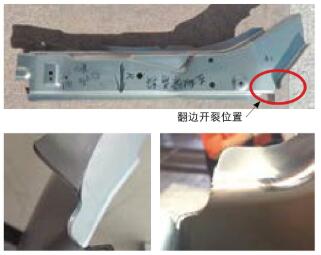 采用材质为HC340/590DP,厚1.8mm 的板料冲压生产左纵梁前段时,拉延修边后的零件在翻边工序出现开裂现象,且为较严重的贯穿型开口裂纹,开裂率高达65%,现场调整压机气垫压力、平衡器压力,均无法得到有效改善。而在相同工艺参数条件下,采用其他厂家同牌号产品生产该零件时,偶尔会出现较为细小的未贯通裂纹,多数情况下该位置基本不出现开裂。零件开裂位置和不同厂家的开裂情况如图1 所示。