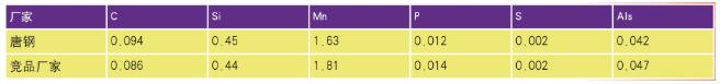 表1 唐钢板料与竞品板料化学成分(wt%)