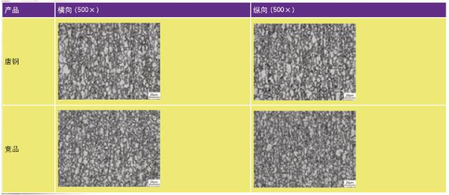 ⑵基础力学性能分析。基础力学性能测试结果如表2 所示,结果显示:唐钢产品的屈服强度较竞品高17MPa,其他力学性能指标相当。