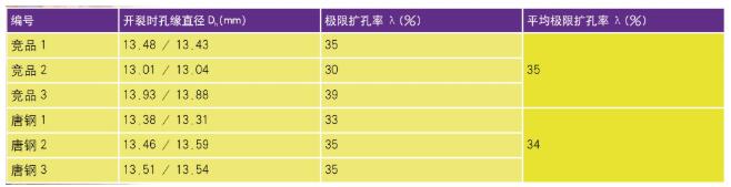 ⑷扩孔性能分析。扩孔率性能测试结果如表4 所示,结果显示:唐钢板料和竞品扩孔率基本一致,其极限扩孔率水平均不是很高。