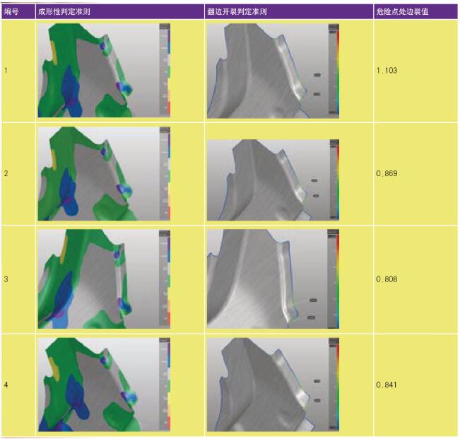 备注:成形性模拟结果中红色表示开裂,黄色表示有严重减薄,有开裂风险。边裂判定准则中边裂值大于1 表示开裂(红色),小于1 未开裂。