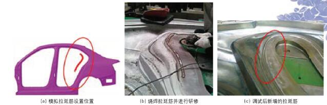 在一汽-大众另一车型VW253 的模具中,拉延模拟时同样出现塑性变形不充分的问题,已经提前要求增加拉延筋,避免同类问题再次发生,如图6 所示。