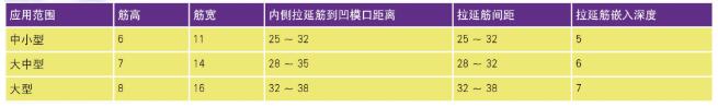 ⑷针对深拉延和成形困难的拉延模,钢板件和铝板件,拉延筋的宽度要求为钢件10mm,铝件12mm,筋高要求为钢件5mm,铝件6mm。拉延筋设计尺寸参数见表1。