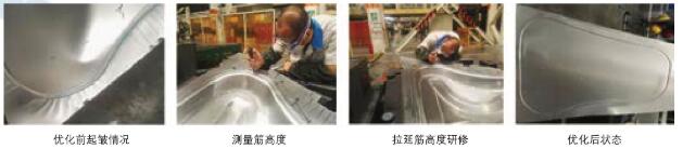 参照拉延筋高度设计标准,结合板料刚开始成形的起皱情况,对局部起皱位置的拉延筋高度进行优化降低,如图13 所示。