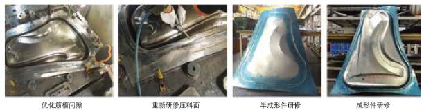 5)拉延筋研修完毕以后,根据拉延筋的位置确认对应筋槽的位置,并进行开槽,后续筋槽R 角需要进行淬火处理,硬度要求达到55HRC 以上,如图5所示。