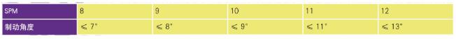 ⑷急停时,压力机滑块会有一定的制动距离,为了避免机器人与压力机滑块碰撞,在机器人与压力机滑块间须留有一定的安全距离。为了提高整线速度,需要尽量减小上下料机器人与压力机滑块间的安全余量,一般对压力机制动角度要求如表1 所示。