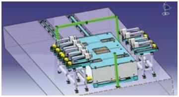 ⑶拆垛小车台面上需配置定位装置。定位装置可以快速拆下并安装到其他位置,定位装置和定位孔将根据生产线所有的料架规格来设计,以适应所有托盘的定位。另外针对无托盘的料垛,拆垛小车配置了激光辅助定位装置,针对各个不同的零件,系统将保存激光定位的参数,并在布局为前8 后8,分张装置安装在导轨上,并整体固定在地面的框架上,分别由各自的气缸驱动。上料时,分张头退回到拆垛小车移动范围外,不会与移动的拆垛小车发生干涉。当拆垛小车完成上料到达拆垛位置后,气缸驱动磁力分张头向垛料移动直至贴紧垛料。