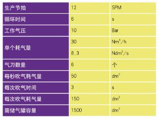 ⑹分张头能够根据板料形状,自动调整角度贴合垛料,角度调整范围为0°~30°。针对铁磁性的板料,根据磁性同性相斥原理,采用强力磁铁分张,强力磁铁安装在分张装置内部,具备气动脱离功能;对于非铁磁性板料(如铝板、304 不锈钢等),采用气刀吹气分张方式,气刀安装在分张头两侧,采用气刀分张时对气压及流量有较大需求,需提供增压设备和储气装置,一般要求气压≥0.8MPa,储气装置容量需根据气刀数量、工作节拍、吹气时间计算,例如本项目,计算结果需要储气罐容量为1.5m3,具体参数见表2。