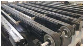 ⑵皮带机(图5)由若干根窄皮带组成,可满足4m 宽的板料传输,窄皮带驱动轮由联轴器连接在一起,由一个变频电机驱动。每根皮带下方安装有真空腔,真空腔上表面中间开槽,另一端通过管路接到真空泵上;每根皮带的真空腔由电磁阀控制,在生产不同尺寸的板料时,对于没有被板料覆盖的皮带,可以通过电磁阀关闭真空腔,真空腔的选择可以保存在零件方案中,只需在调试时设置一次,后续生产时只需调用方案即可。