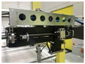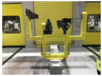 ⑵本项目配备的分张系统和真空皮带机兼顾了铝板和钢板两种材料的生产,完全契合了现阶段新能源汽车车身材料的应用趋势。拆垛机器人的ATC 功能使拆垛机器人配备了多套拆垛端拾器,避免了端拾器与分张头之间的干涉,极大扩展了生产线对于多品种、差异化零件的生产能力。通用的双件分离主杆能满足所有一模双件的生产,简化了端拾器的设计制作。