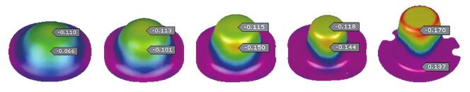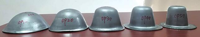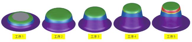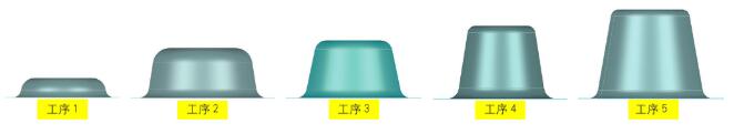 这种新的成形技术与传统方案的区别在于并不是采用筒形的拉深成形方法,而是从工序1的半圆形凸包状开始成形,后工序逐渐减小拔模角增加深冲压高度,并最终成形为产品形状的过程。图5为优化后的冲压工艺方案,各工序之间为相互紧密联系关系,即前工序与后工序之间存在关联度。首先工序1采用大的拔模角度,上部为球形,这样有利于材料的进料量最大化。接着工序2拔模角减小10°,成形深度增加8.7mm,圆角半径进一步减小,工序3拔模减小10°,成形深度再增加5.6mm,工序4拔模角减小5°,成形深度基本保持不变,工序5为最终产品形状,拔模角减小了3.3°,高度减小4.2mm。
