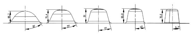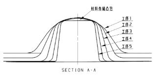 图4为第1序至第5序的凸模截面图,可以看到与以往传统工艺方案最大的不一样在于从第一序开始是一个圆弧形凸包结构,然后再逐渐过渡到第五序成形至最终形状,主要体现在拔模角和深度的变化。