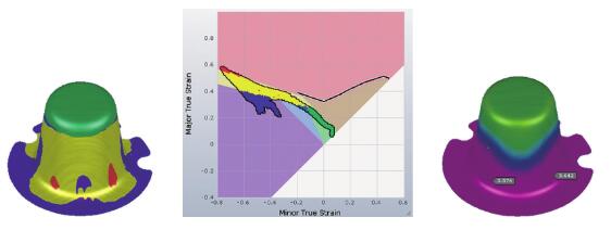 如图8所示,从零件成形极限可以看到在产品底部存在开裂,通过FLD图可以知道,此处开裂位置为压缩-拉深状态,查看此处成形后,料厚为3.6mm,料厚增加21%,因此判断此处不会存在开裂。