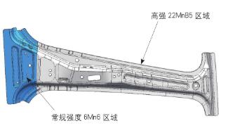 为了达到轻量化和更加适配侧碰的需求,保证在做到轻量化的同时也能做到车身安全性的提高,可以采用激光拼焊技术,将不同料厚不同材质的铝硅镀层材料拼焊起来,拼焊材料经过加热炉加热,热成形模具冲压,保压淬火后,得到我们需要的不同强度的热成形零件。