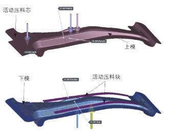 ⑵工具体设置:主要涉及工艺过程中上模、下模、压料芯、压料块的分布,如图3所示。