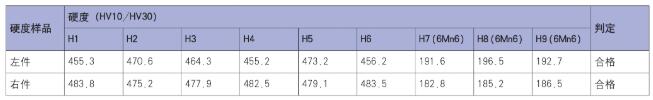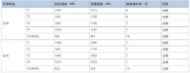 6Mn6区域由于材料特性,在冷却过程中不产生马氏体从而形成低强度区域,机械性能要求为抗拉强度520~700MPa,屈服强度340~470MPa,延伸率A50≥17%,硬度162~215HV。