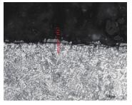 气进行气氛保护,氧化皮厚度一般在5μm左右(图7)。而用真空炉制备的零件,其氧化皮厚度一般小于2μm(图8)。