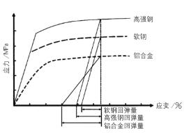回弹是铝板弯曲成形过程中普遍存在的现象,是卸载过程中内力重新分布引起的。一般铝板回弹要大于钢板的回弹,这主要是材料本身微观结构差异导致。图1是铝板、软钢和高强钢3种材料典型应力-应变曲线,从图1可以看出,同样的应变条件下卸载,铝板的回弹要比普通钢板大得多。