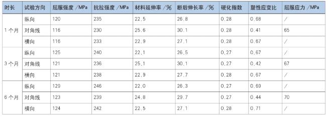 本次分析的是江淮汽车正在生产的某个前罩外板,采用的外板料来自Novelis e170,厚度为0.9mm,由于板料的加工和材料特点,铝板是具有时效性的,从板料冲压成形角度考虑,3个月时的性能为最佳,并且需进行6个月的验证,用以指导板料的生产,如表1所示。