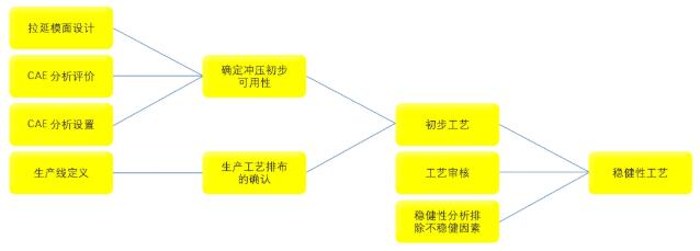 零件的成形使用AutoForm R7进行分析,对软件的设置和参数的评估,需要根据相应企业标准进行设置,用以判断变薄、开裂、起皱、回弹、全局的变薄率等大的问题项,然后针对各个问题项进行解决,并结合生产线的要求,调整初版的工艺,最后进行工艺审核和稳健性因素的排查,得到稳健性的工艺工法,分析流程如图3所示。