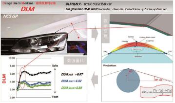德国Audit质量评审人员通过DLM棱线锐度特征值(图1)判定车身棱线锐度质量。评审标准一,棱线锐度符合性:与车身设计的CAD理论锐度相比,棱线实际锐度越大,目视效果越好,量化到数值上,其DLM数值越大。评审标准二:棱线锐度稳定性,监控不同批次的棱线锐度变化,变化数值越小,越稳定,量化到数值上,其DLM数值曲线重合度越高。