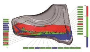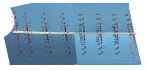 数据建立分为:GOM扫描(图2)、三坐标测量(图3)、数控机床测量(图4)。GOM扫描前将模具放置在压机工作平台上,保证整体平度偏差在0.1mm以内。对比GOM扫描数据与模具原始数据,发现棱线前段磨损量最大数值为-0.098mm,后段磨损量最大数值为-0.048mm,其他区域数值在-0.03mm以内。三坐标测量棱线两侧30mm以内数值,间隔50mm测量一次,同时测量远端型面点位,对比三坐标测量数据与模具原始数据,发现棱线前段磨损量最大数值为-0.153mm,后段磨损量最大数值为-0.144mm,其他区域数值在-0.08mm以内。同时对比数控机床测量数据与三坐标测量数据,两者数据变化趋势一致,偏差值在0.03mm以内,多次同理论数据拟合,并采用划线试走刀方式,查看划线深度判定棱线型面变量,构建棱线A面数控加工数据。