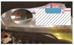 焊接坡口(图5)采用数控随型加工,为保证棱线锐度修复后表面硬度达到60HRC,且硬度均匀,坡口深度3~4mm,整体深度偏差控制在1mm以内。为保护模具型面研修基准,提升棱线锐度修复精度,坡口加工宽度10mm(以棱线为中心,单侧5mm)。因模具前期进行了表面镀铬处理,焊接性能下降,为使焊材与模具母材焊接熔合性更好,防止出现焊道剥离、裂纹等焊接缺陷,坡口截面加工成U形,并保证坡口边沿直线度。坡口数控加工后,采用手工锤击的方法,使坡口边沿产生塑性变形,保证坡口边沿2mm内高于型面0.5mm以上。