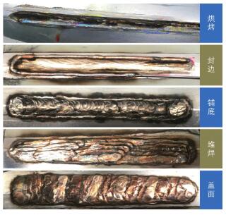 型面焊接使用手工氩弧焊接的方法(图6),按照烘烤→封边→铺底→堆焊→盖面的焊接顺序。模具批量生产,大量的油脂渗入模具基体,焊接前进行火焰烘烤能有效避免焊接砂眼。封边焊接采用熔焊丝方法,使用UTPA702焊丝,焊接电流70~80mA。为避免焊道边沿塌陷,禁止正面锤击焊道。铺底焊接使用塑性较好的UTP8051Ti焊丝,焊接电流100~110 mA,焊接方向与烘烤方向相反,分段焊接,焊道长度20~30mm,焊道接头与烘烤接头错开,焊接后马上进行锤击,使焊道产生塑性变形,能有效避免应力集中产生焊接裂纹。堆焊焊接使用硬度较高的UTPA600焊丝,焊接要点同铺底焊接一致。盖面焊接同样使用UTPA600焊丝,但焊道方向与堆焊方向成90°(横向焊接),保证棱线区域无焊接缺陷。所有焊接过程必须控制焊道温度在300℃以内,焊后使用石棉布进行保温,待冷却至常温。