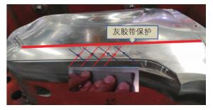 数控加工使用MECOF五轴联动数控加工中心,整体加工精度控制在0.05mm以内。本次棱线加工均是按照RO数值设定,尝试创新机加走刀轨迹,由原来的垂直棱线走刀和45°走刀更改为平行棱线走刀。按照:测量→粗加工→半精加工→测量→精加工顺序进行。加工前,通过数控机床测量,检查棱线焊接区域以外的型面是否因焊接温度变化而产生变形。粗加工留量0.5mm,在加工余量为0.15mm时更换新刀片,重新加工走刀一次。在半精加工留量为0.1mm时,再次检测加工余量,防止加工过切,且每次检测前对加工型面和刀具进行清理(传统的空气吹屑方法无法完全保证铁屑的清理,少数粘连的铁屑依然存在,导致检测中有少数点位出现较大偏差)。最后两刀的检测前,均要求操作者仔细去除粘连铁屑,保证检测精度。在半精加工留量为0.05mm时,在加工区域喷涂显影剂,待显影剂完全干透后(显影剂厚度为0.02~0.03mm),再进行精加工,观察非棱线修复区域以外的显影剂是否有刮擦痕迹。精加工使用φ30mm的镜面球刀,主轴转速9000r/min,进给速度7000mm/min,精加工留量0.03mm,用于最后钳工手工研修。